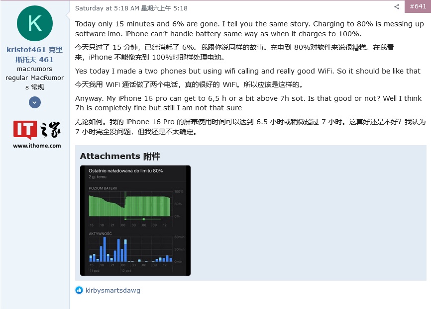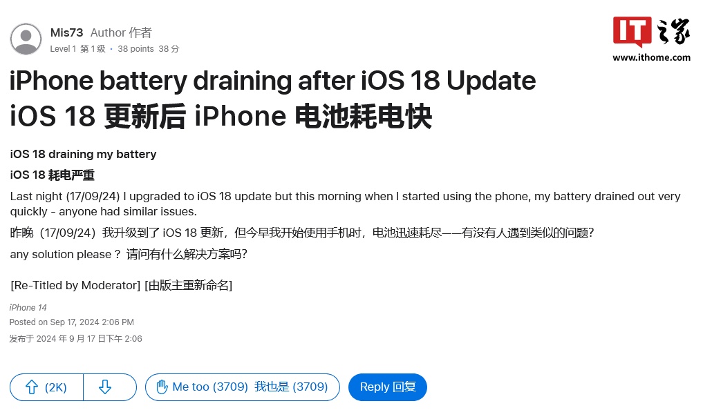 在 MacRumors 论坛上有个创建于 2024 年 6 月 10 日的 iOS 18 续航不竭帖,专诚蚁合用户响应,搁置IT之家发稿为止,当今共盖楼 770 条,在 iOS 18 和 iPhone 16 系列发布后,有关的用户响应更为密集。