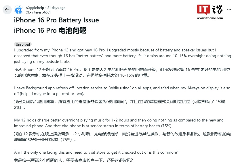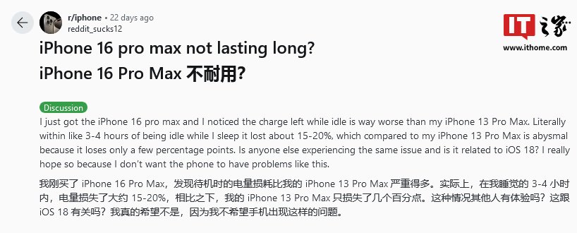 IT之家 10 月 18 日音讯,科技媒体 MacRumors 昨日(10 月 17 日)发布博文,报谈称凭据 Reddit 社区、苹果营救论坛上的帖子和留言,部分 iPhone 16、iPhone 16 Pro 系列用户响应 iOS 18 系统存在耗电过快问题。